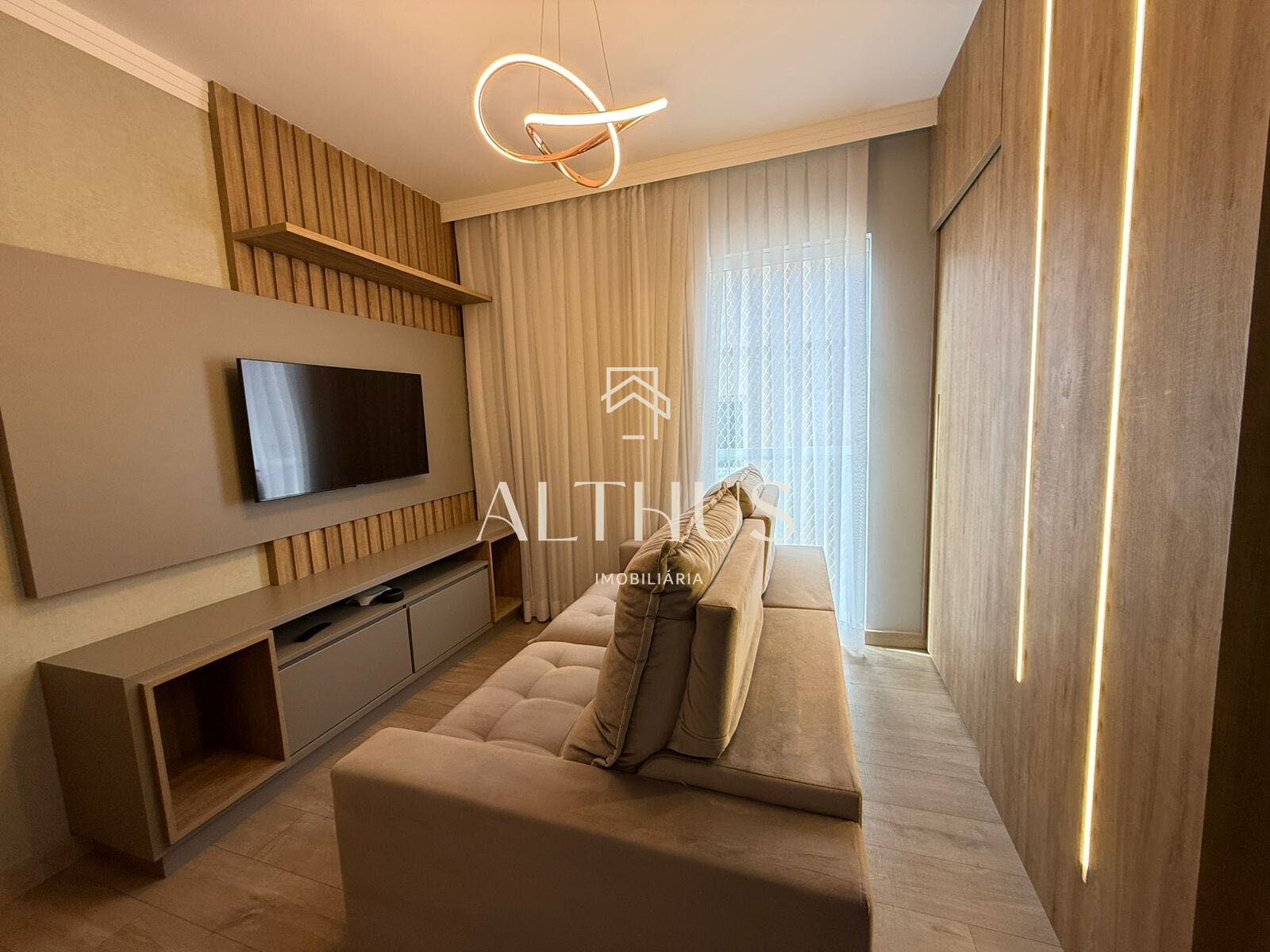 • Sala com painel, TV, cortinas e automação